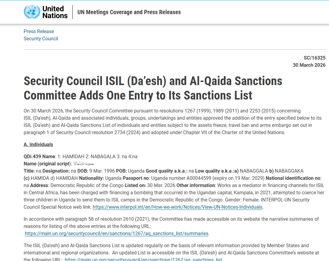 SC/16325 30 March 2026 Security Council ISIL (Da’esh) and Al-Qaida Sanctions Committee Adds One Entry to Its Sanctions List On 30 March 2026, the Security Council Committee pursuant to resolutions 1267 (1999), 1989 (2011) and 2253 (2015) concerning ISIL (Da’esh), Al-Qaida and associated individuals, groups, undertakings and entities approved the addition of the entry specified below to its ISIL (Da’esh) and Al-Qaida Sanctions List of individuals and entities subject to the assets freeze, travel ban and arms embargo set out in paragraph 1 of Security Council resolution 2734 (2024) and adopted under Chapter VII of the Charter of the United Nations. A. Individuals QDi.439 Name: 1: HAMIDAH 2: NABAGALA 3: na 4:na Name (original script): حميدة ناباجالا Title: na Designation: na DOB: 9 Mar. 1996 POB: Uganda Good quality a.k.a.: na Low quality a.k.a.:a) NABAGGALA b) NABAGGAKA (c) HAMIDA d) HAMIDAH Nationality: Uganda Passport no: Uganda number A00044599 (expiry on 19 Mar. 2029) National identification no: na Address: Democratic Republic of the Congo Listed on: 30 Mar. 2026 Other information: Works as a mediator in financing channels for ISIL in Central Africa, has been charged with financing a bombing that occurred in the Ugandan capital, Kampala, in 2021, attempted to coerce her three children in Uganda to send them to ISIL camps in the Democratic Republic of the Congo. Gender: Female. INTERPOL-UN Security Council Special Notice web link: https://www.interpol.int/en/How-we-work/Notices/View-UN-Notices-Individuals. In accordance with paragraph 58 of resolution 2610 (2021), the Committee has made accessible on its website the narrative summaries of reasons for listing of the above entries at the following URL: https://main.un.org/securitycouncil/en/sanctions/1267/aq_sanctions_list/summaries. The ISIL (Da’esh) and Al-Qaida Sanctions List is updated regularly on the basis of relevant information provided by Member States and international and regional organizations. An updated List is accessible on the ISIL (Da’esh) and Al-Qaida Sanctions Committee’s website at the following URL: https://main.un.org/securitycouncil/en/sanctions/1267/aq_sanctions_list. The United Nations Security Council Consolidated List is also updated following all changes made to the ISIL (Da’esh) and Al-Qaida Sanctions List. An updated version of the Consolidated List is accessible via the following URL: https://main.un.org/securitycouncil/en/content/un-sc-consolidated-list.